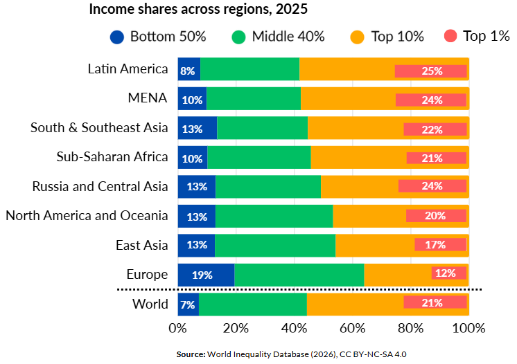 We accessed new administrative data for Brazil and Chile revealing that inequality at the very top (within the top 1%) was previously underestimated. As a result, Latin America once again emerges as the most unequal region, overtaking MENA, when comparing the income shares of the top 10% with those of the bottom 50%. Europe remains the least unequal region in the world.