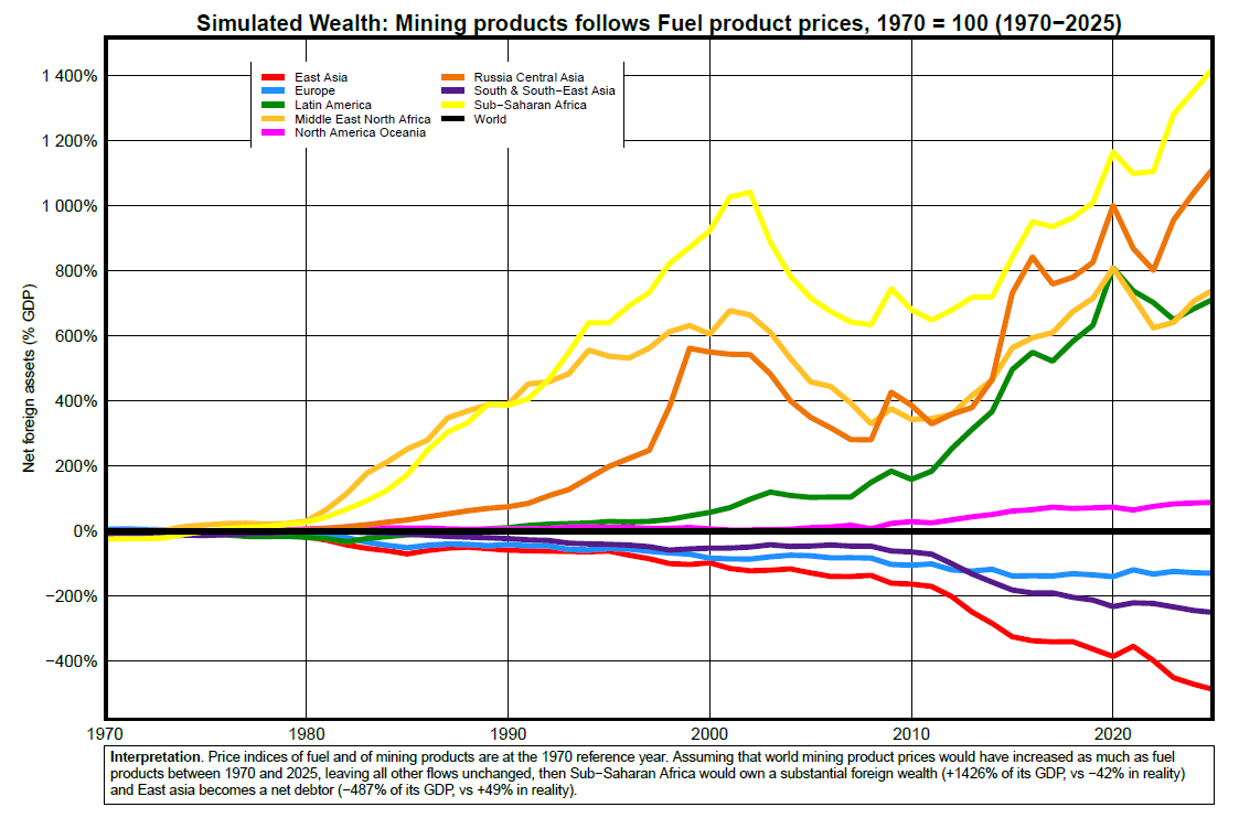 In this paper, Simon Keller studies how the long-run evolution of primary commodity prices has shaped foreign wealth accumulation and development paths across world regions. Using the new WBOP dataset (1962–2025) and constructing world export price indices from UN Comtrade 5-digit trade data, he runs counterfactual simulations to estimate how alternative price trajectories—for agricultural, fuel, and mining products—would have affected countries’ net foreign asset positions and income levels.