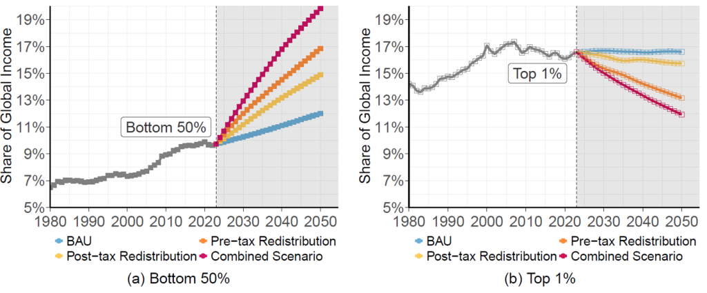 “Convergence between countries will not be enough to significantly reduce global inequality by 2050. What will matter most is how income is redistributed within each country. If all countries aligned with their most equal neighbour, the share of income going to the poorest 50% could nearly double — rising from 10% to 19% of global income.”