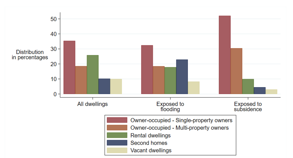 • There are large disparities in exposure to flooding and subsidence: once properties owned by non-residents are included, flood risk appears to disproportionately affect second-home owners, while subsidence mainly affects single property homeowners.