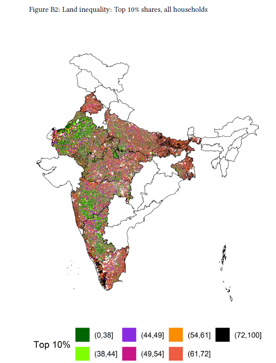 - Historical institutions leave persistent effects on land distribution. Areas historically governed under landlord-based colonial land tenure systems tend to display higher levels of land concentration today. Also, the villages falling under the direct-rule of British colonialism tend to have higher land inequality compared to those which were under Indian rulers.