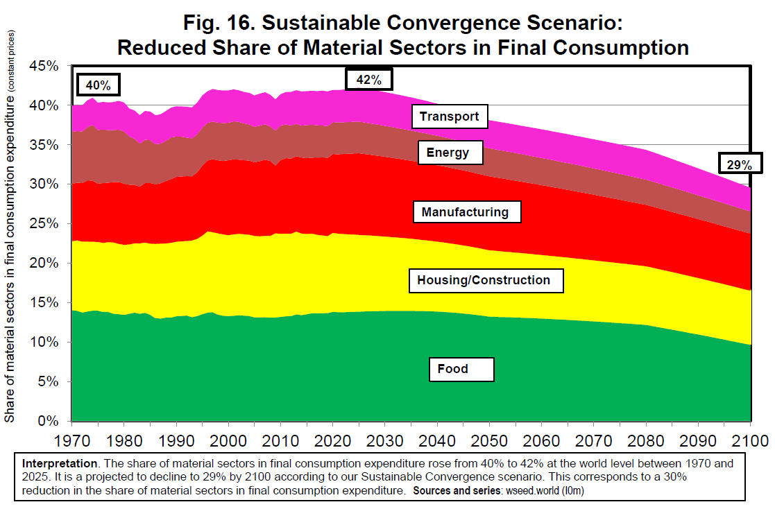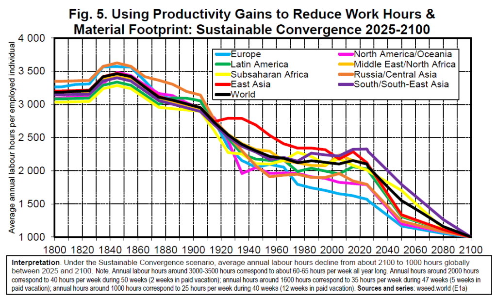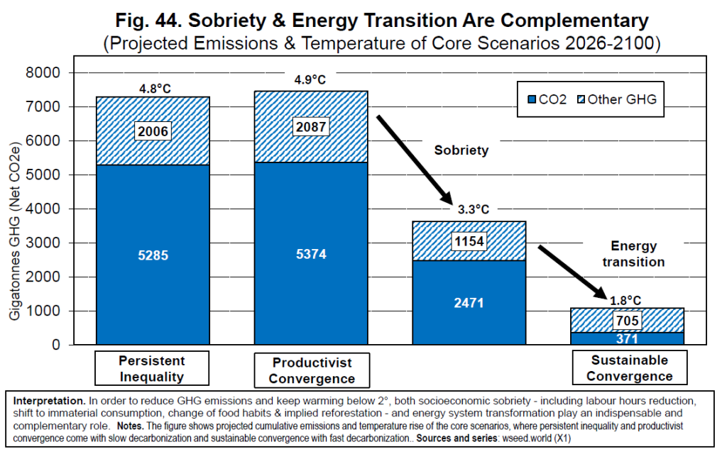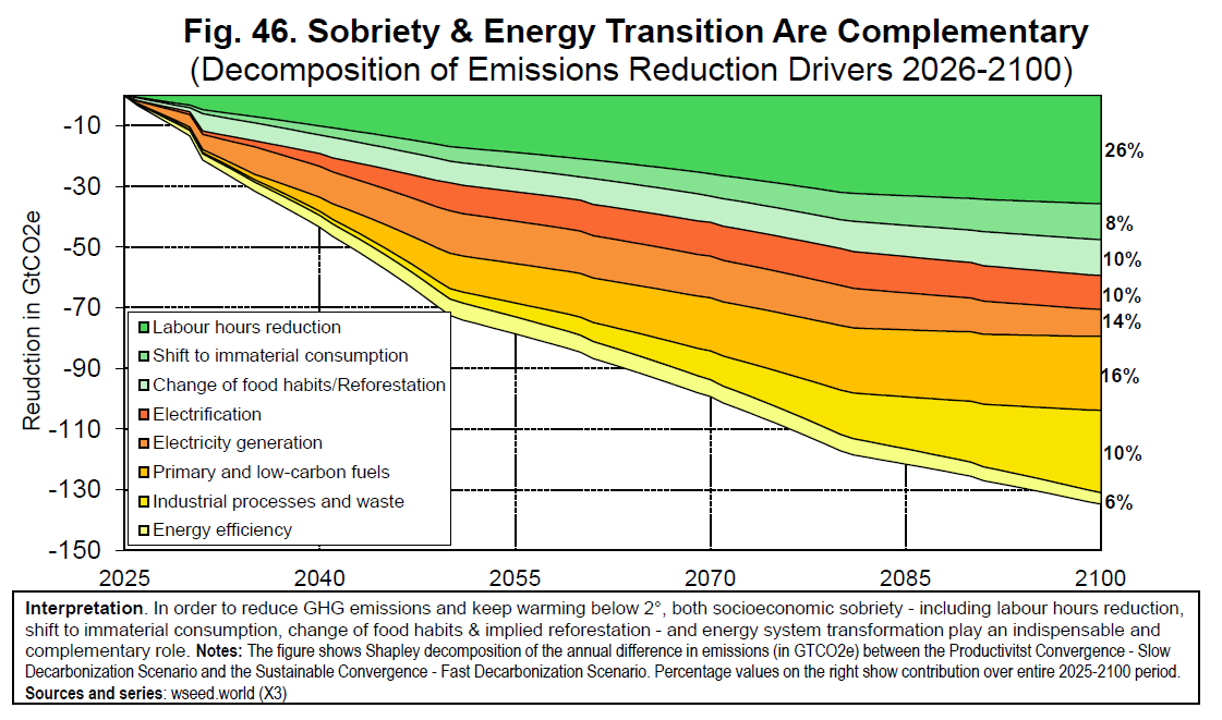 Rapid energy transition alone is not sufficient: achieving the 2°C target also requires a drastic reduction in working hours (roughly halving global annual hours), a major shift in consumption from material to immaterial sectors (e.g. education and health), and substantial changes in food habits (including large reductions in red meat consumption and deforestation).