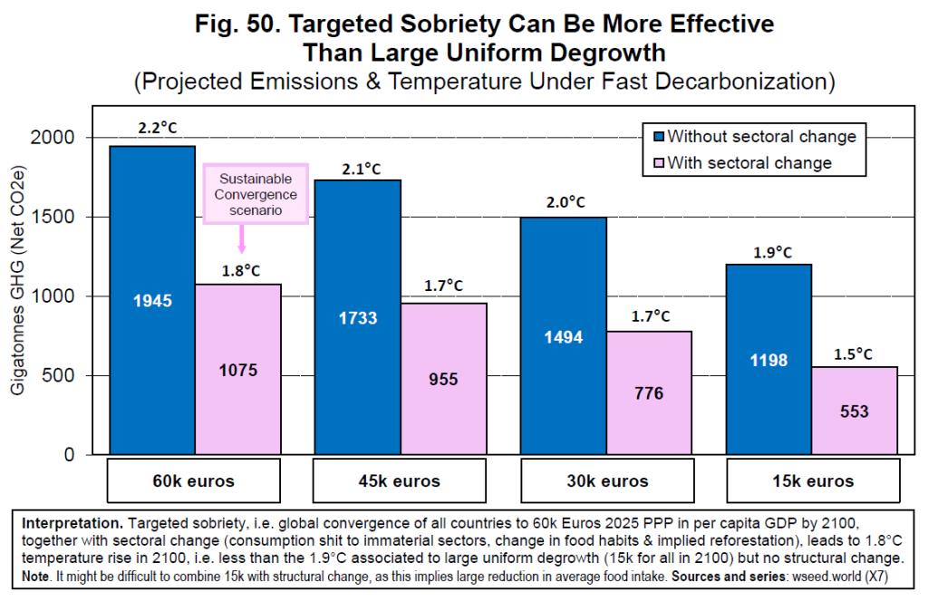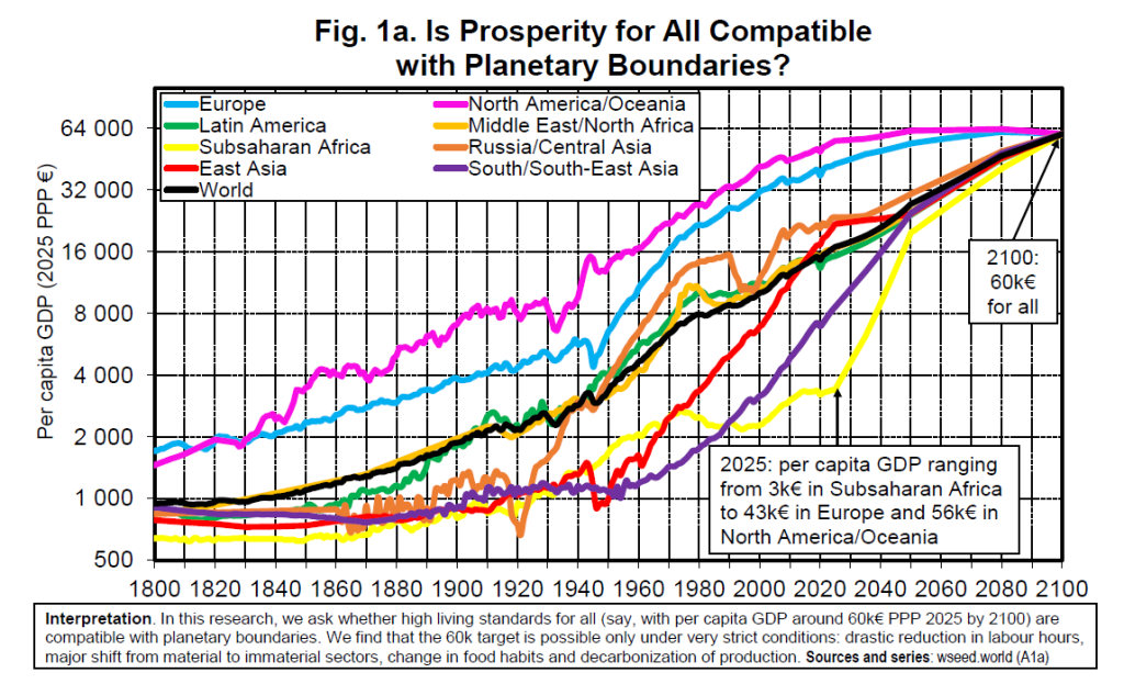 Global convergence to €60,000 (2025 PPP) per capita by 2100 is compatible with limiting warming to 2°C only under very strict conditions combining rapid decarbonization with deep structural transformation (“sobriety”).