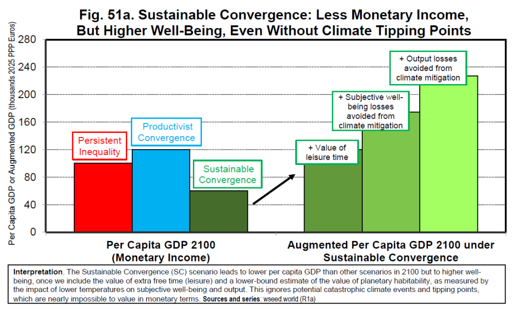 The Sustainable Convergence pathway improves comprehensive well-being (including the value of leisure time and planetary habitability) in all regions relative to higher-GDP but high-emissions alternatives.