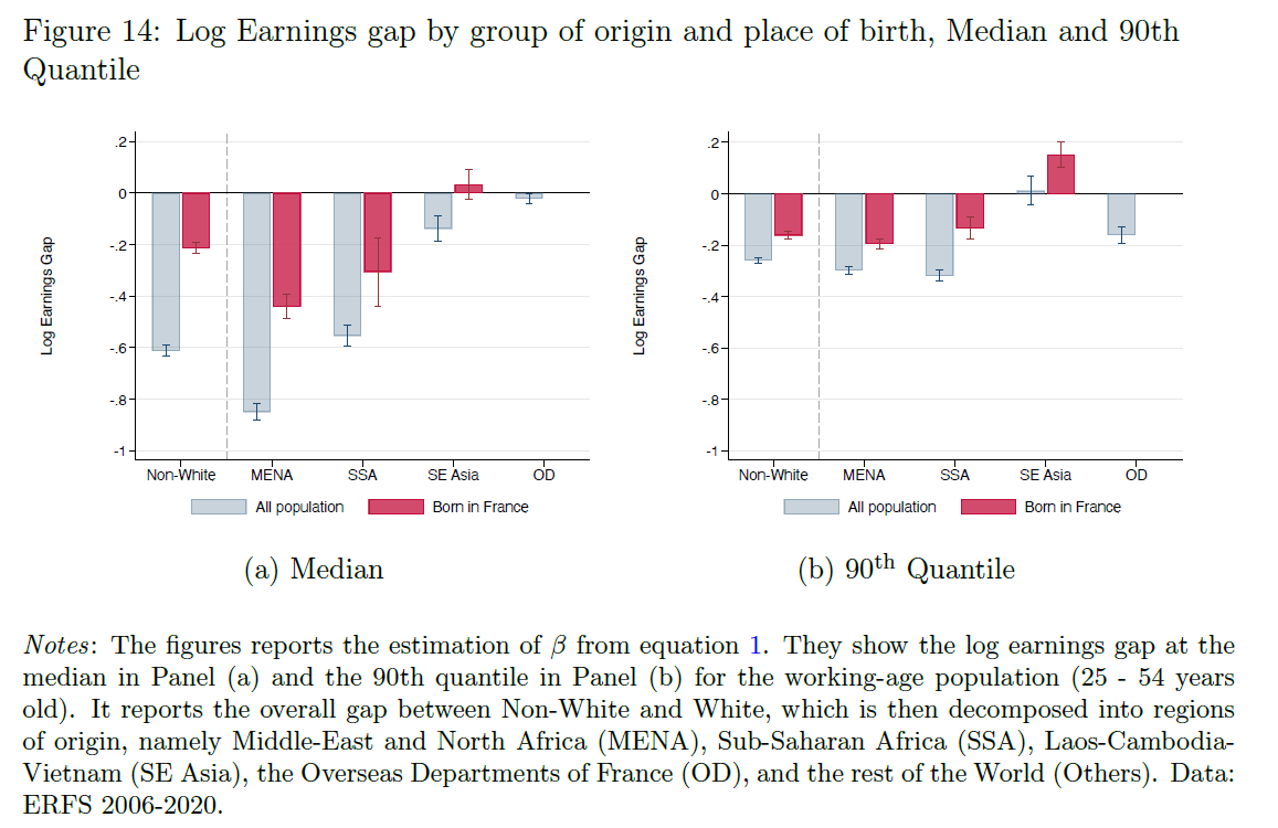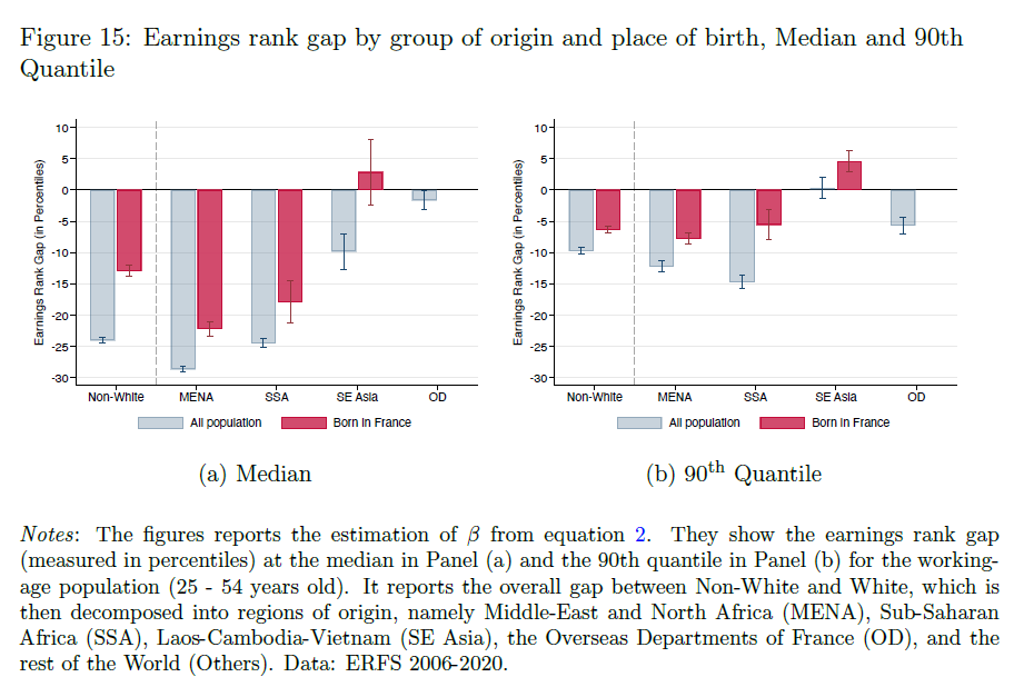 • Racial minorities in France face substantial earnings penalties, especially at the median of the income distribution, with Middle Eastern/North African (MENA) and Sub-Saharan African individuals most affected.