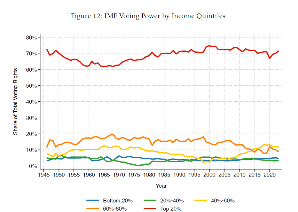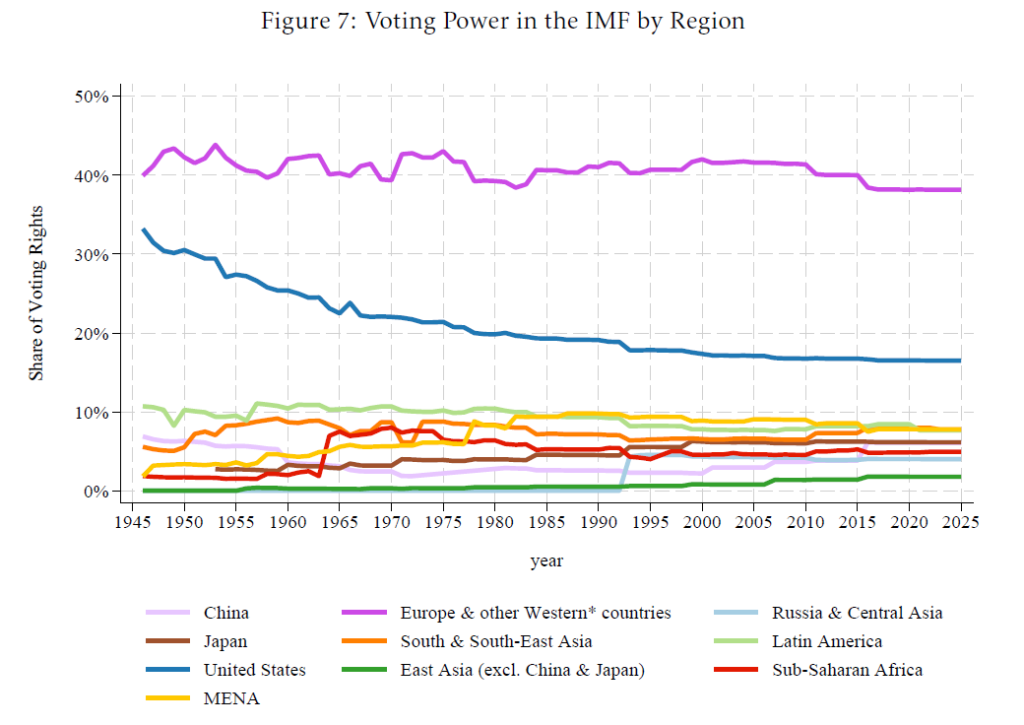 1. Who holds power depends on institutional design—and this has direct distributional consequences. In many financial institutions, voting rights are effectively “priced”: influence is tied to financial contributions. In these systems, richer countries are able to acquire voting power at a much lower relative cost. The USA holds 16.6% of IMF voting power; the G7 together account for 41%, and when including other rich economies this rises to around 70%, while paying 26 times less per vote (as a share of GDP) than poorer countries. In other words, if a poor country were to match the voting power of a rich country contributing 1% of its GDP, it would need to contribute 26% of its GDP. This pattern is not specific to the IMF; it is also observed in the World Bank (IBRD) and other multilateral development banks. This also translates into regressive burden-sharing. Despite having less fiscal capacity, poorer countries often contribute more relative to their income than richer countries in these institutions. By contrast, in more democratic settings—such as the United Nations General Assembly—voting power is less tightly linked to financial capacity, and burden-sharing has become progressive.