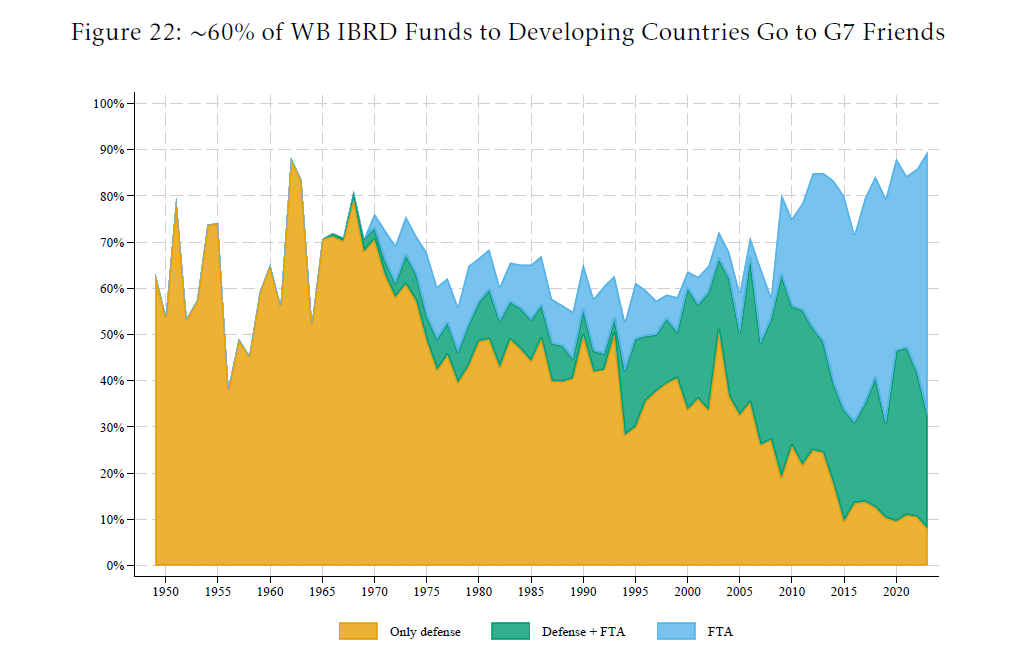 2. Who benefits from international financing is systematically linked to who holds power. In institutions with concentrated voting structures, resources are disproportionately directed toward countries that are geopolitically aligned with the most powerful shareholders. Around 70% of World Bank lending is directed toward countries geopolitically aligned with the G7. These “friend” countries represent 52% of the developing world’s population and 48% of its GDP. The pattern is even starker for the IMF: 67% of loans go to G7-aligned countries, which account for only 6% of the population and 3% of GDP. By contrast, the United Nations, which operates under a more democratic governance structure, does not exhibit this pattern.