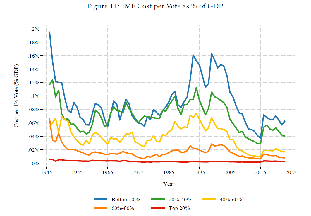 1. Who holds power depends on institutional design—and this has direct distributional consequences. In many financial institutions, voting rights are effectively “priced”: influence is tied to financial contributions. In these systems, richer countries are able to acquire voting power at a much lower relative cost. The USA holds 16.6% of IMF voting power; the G7 together account for 41%, and when including other rich economies this rises to around 70%, while paying 26 times less per vote (as a share of GDP) than poorer countries. In other words, if a poor country were to match the voting power of a rich country contributing 1% of its GDP, it would need to contribute 26% of its GDP. This pattern is not specific to the IMF; it is also observed in the World Bank (IBRD) and other multilateral development banks. This also translates into regressive burden-sharing. Despite having less fiscal capacity, poorer countries often contribute more relative to their income than richer countries in these institutions. By contrast, in more democratic settings—such as the United Nations General Assembly—voting power is less tightly linked to financial capacity, and burden-sharing has become progressive.