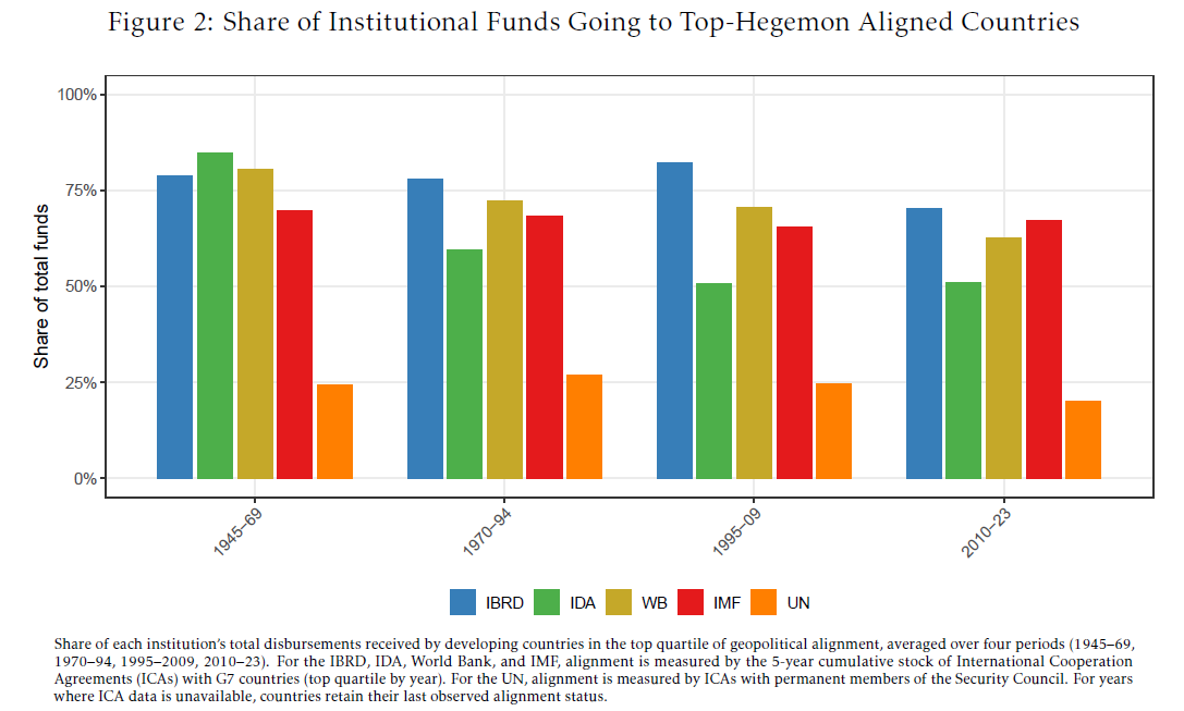 2. Who benefits from international financing is systematically linked to who holds power. In institutions with concentrated voting structures, resources are disproportionately directed toward countries that are geopolitically aligned with the most powerful shareholders. Around 70% of World Bank lending is directed toward countries geopolitically aligned with the G7. These “friend” countries represent 52% of the developing world’s population and 48% of its GDP. The pattern is even starker for the IMF: 67% of loans go to G7-aligned countries, which account for only 6% of the population and 3% of GDP. By contrast, the United Nations, which operates under a more democratic governance structure, does not exhibit this pattern.